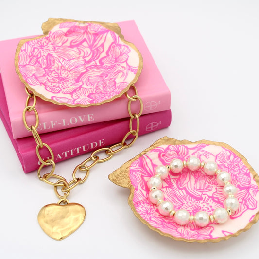 Natural sea shells decoupaged in beautiful patterns perfect as a jewelry dish, ring holder or a decorative accent. The perfect blend of nature and artistry! Select any shell and add the Glass Pearl Bracelet at 30% off!