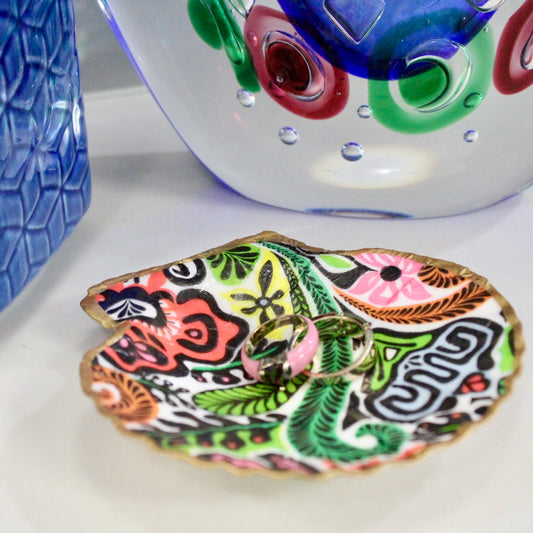 Natural sea shells decoupaged in beautiful patterns perfect as a jewelry dish, ring holder or a decorative accent. The perfect blend of nature and artistry! Select any shell and add the Glass Pearl Bracelet for 20% off the bracelet!