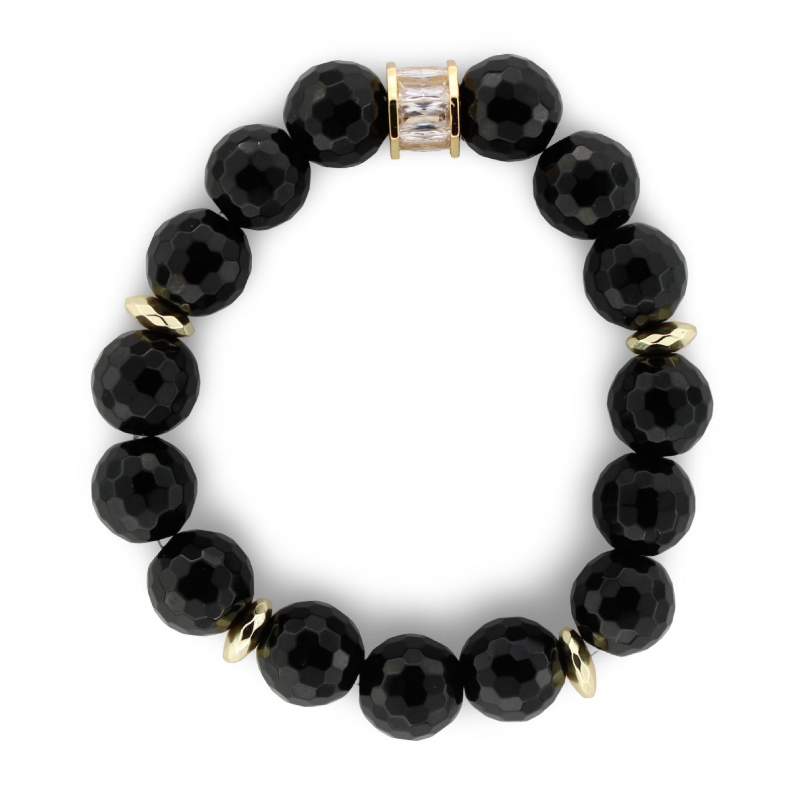 All-black faceted beads catch the light beautifully, finished with a single CZ accent for that subtle touch of glam. Made to approximately 7 1/4" on very strong stretch band. Ships beautifully packaged.