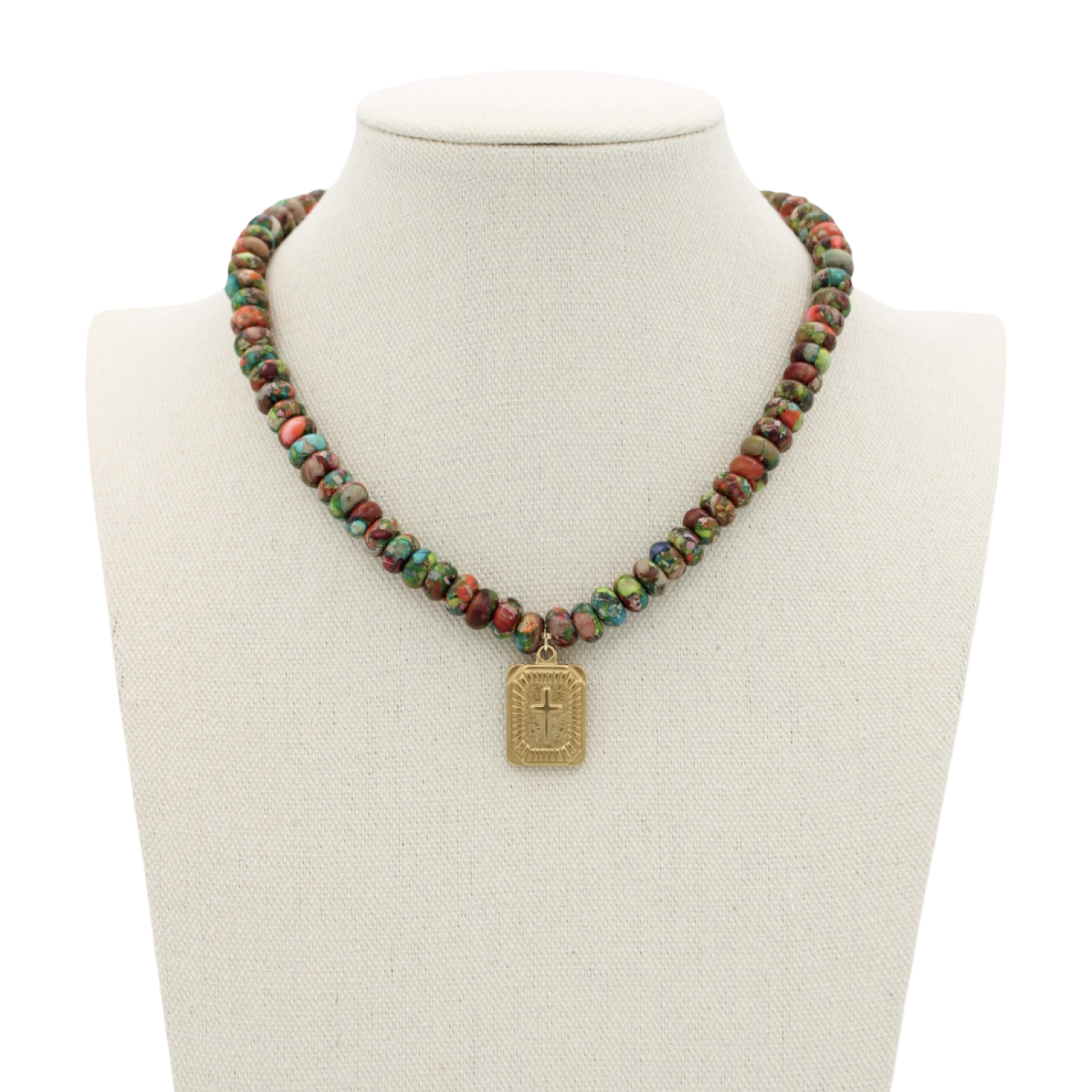 The Artisan Grace Necklace is a meaningful blend of craftsmanship and faith. Features multicolor sea sediment beads in rich, earthy tones. A gold cross charm adds a timeless touch, symbolizing strength, guidance, and grace. Thoughtfully designed for everyday wear, this piece carries both natural beauty and spiritual inspiration. Hand beaded to approximately 16" + 2" extender. Lobster clasp closure. Perfectly compliments the Artisan Grace bracelet.