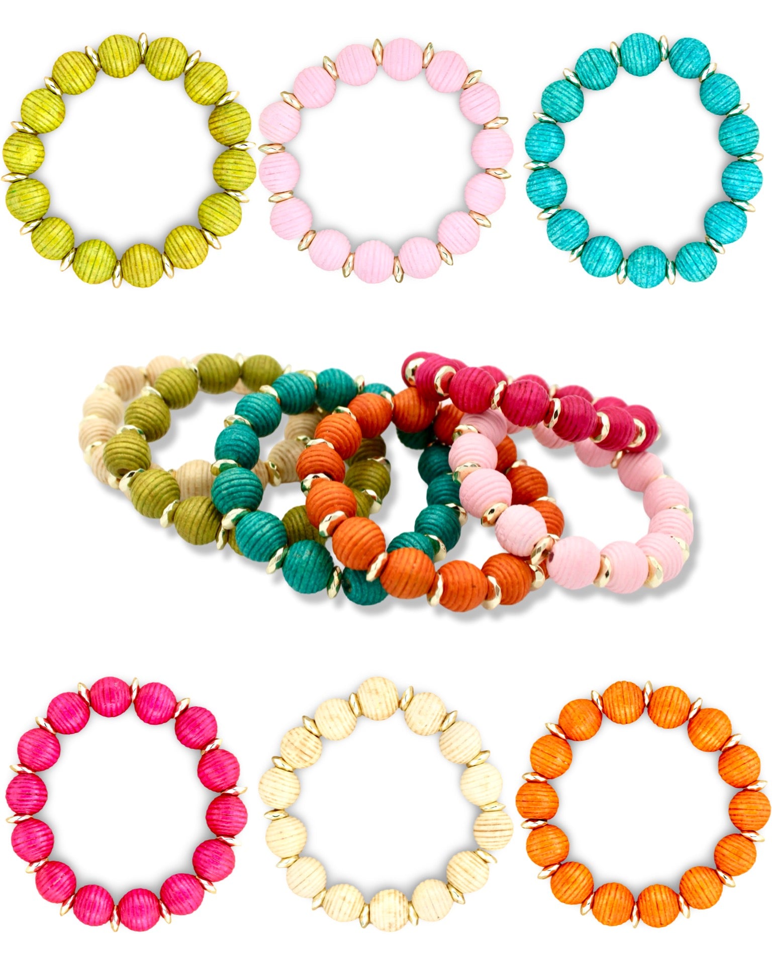 Textured wood beads with gold accents. Stretch bracelet handmade on very strong stretch band to standard length of about 7 1/4”. Very lightweight!