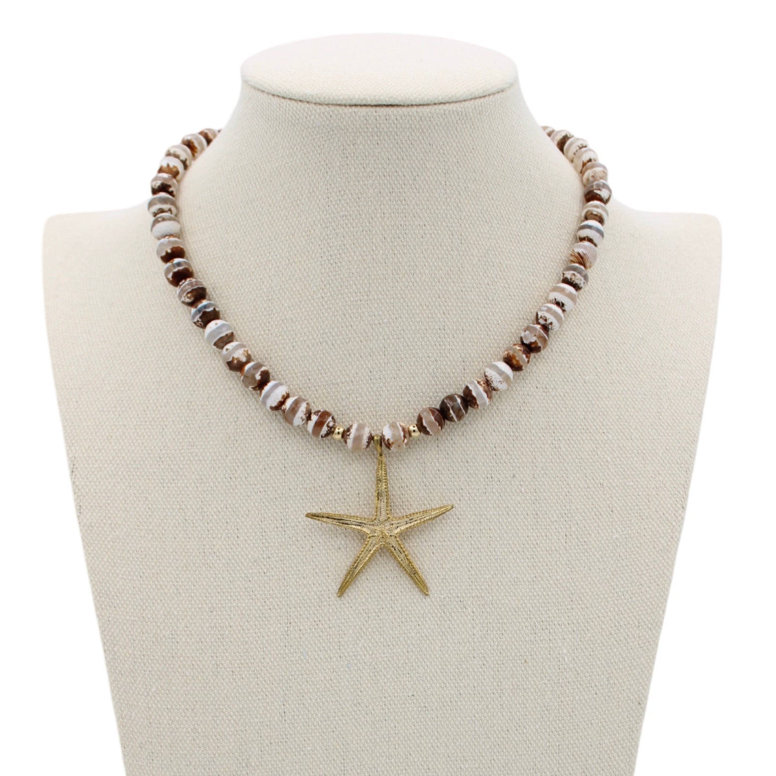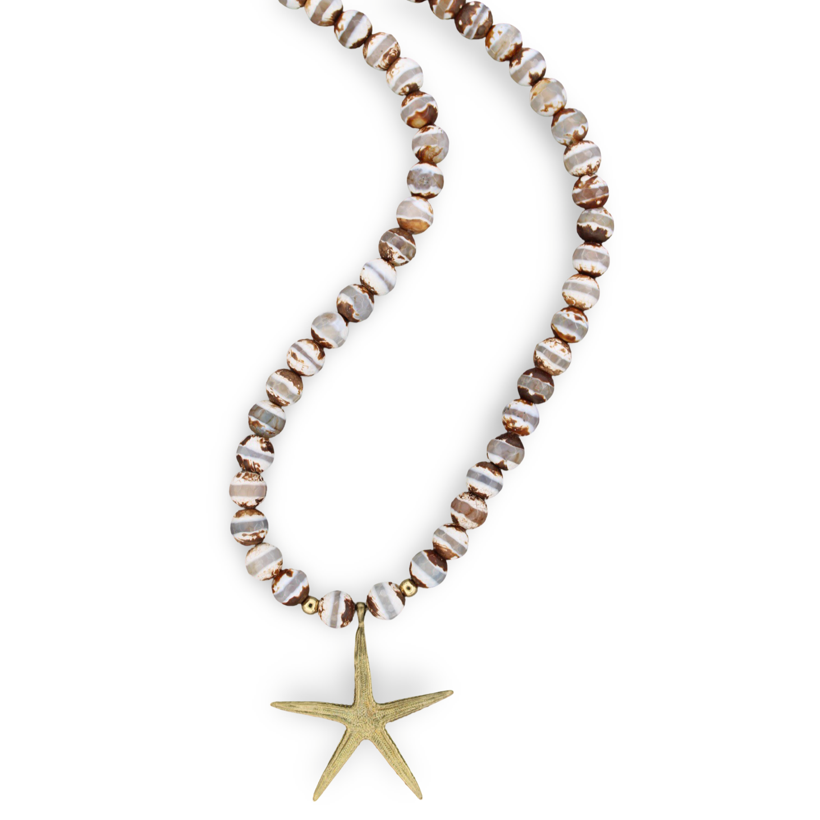 8mm faceted Tibetan agate beads, 40x45mm brass starfish pendant, lobster clasp closure, approximately 16" + 2" extender chain, hand beaded. Matching bracelet also available.