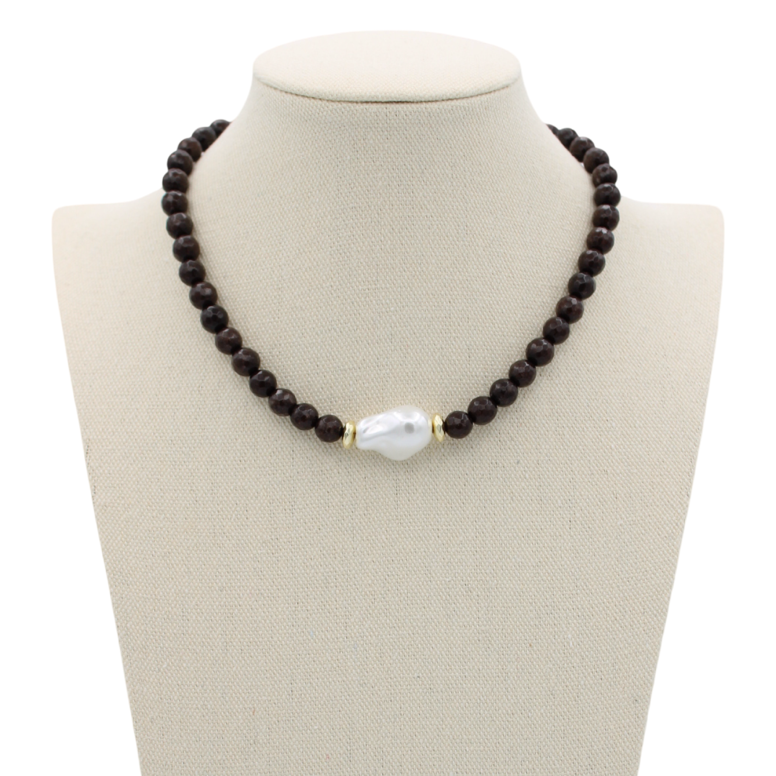 Chocolate brown is a personal favorite and definitely trending this season! This versatile necklace pairs 8mm faceted chocolate brown jade beads with a striking baroque pearl accent. Hand beaded to approximately 16" + 2" extender chain. Lobster clasp closure.