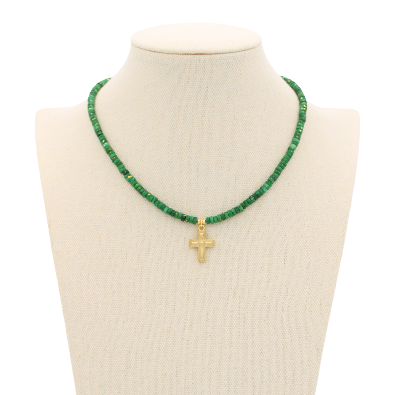 Beautiful and dainty! Rich, saturated shades of green with a few touches of blue. 4mm dolomite heishi beads hand beaded to approximately 15" + 2" extender. Matte gold cross charm. The perfect necklace for layering or keeping it simple on it's own. Truly unique in style and coloration. Very lightweight.