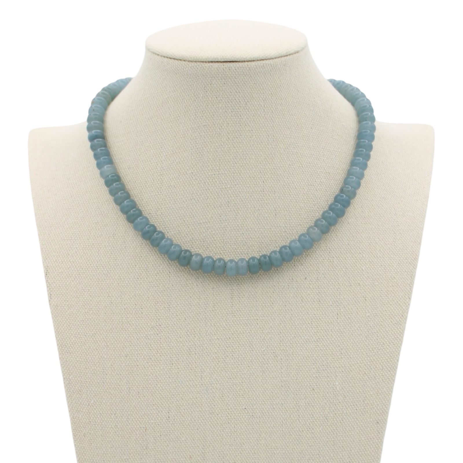 A great shade of french blue to pair with neutrals and denim. 8mm rondelle jade beads, hand beaded to approximately 16" + 2" extender chain. Perfect for layering with other beaded necklaces.