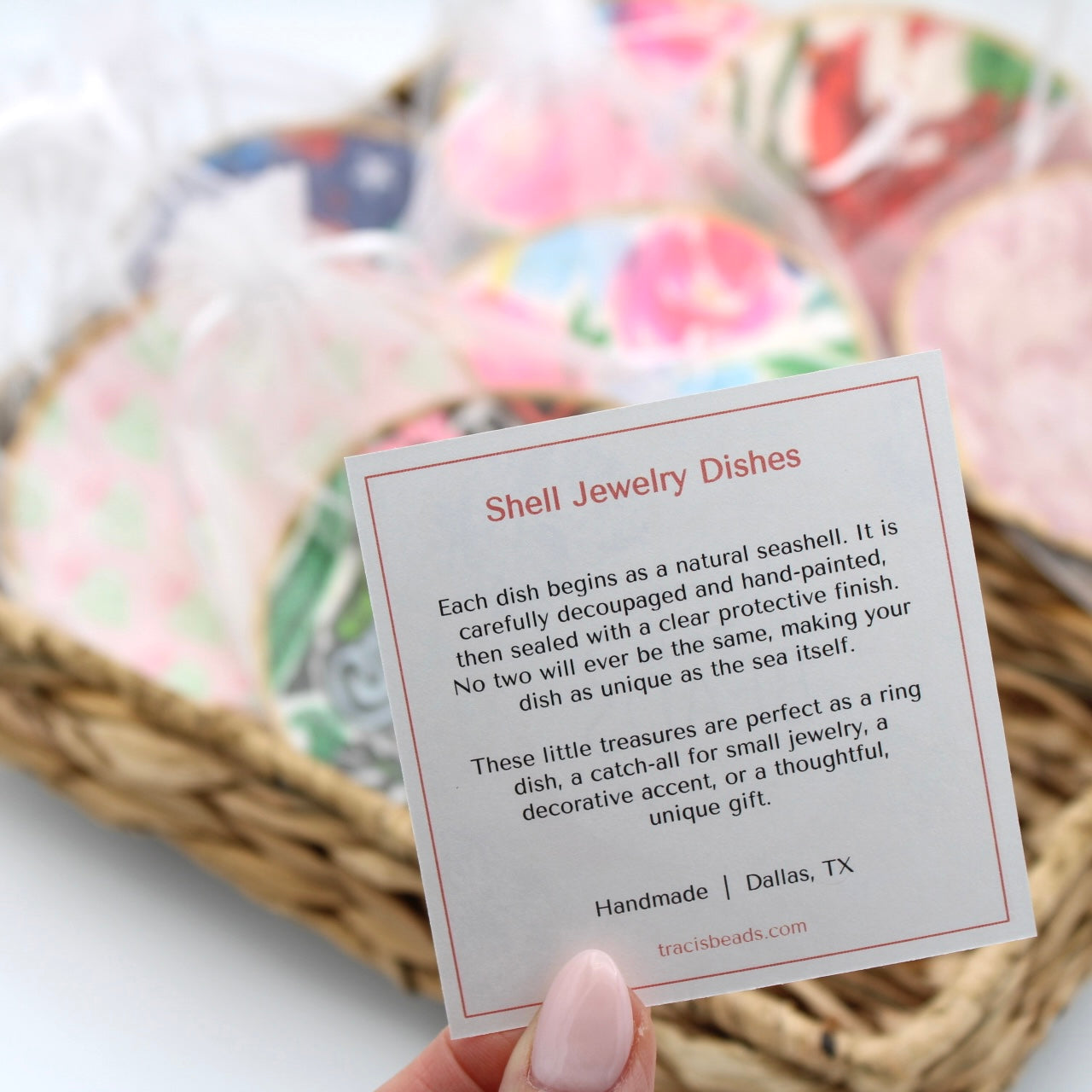 Each of these one-of-a-kind jewelry dishes begins as a natural sea shell, carefully selected for its organic shape and beauty. Measuring approximately 4–5 inches, no two are ever exactly alike. The interior is artfully decoupaged with custom designs and finished with hand-painted gold edges, adding a touch of coastal luxury.