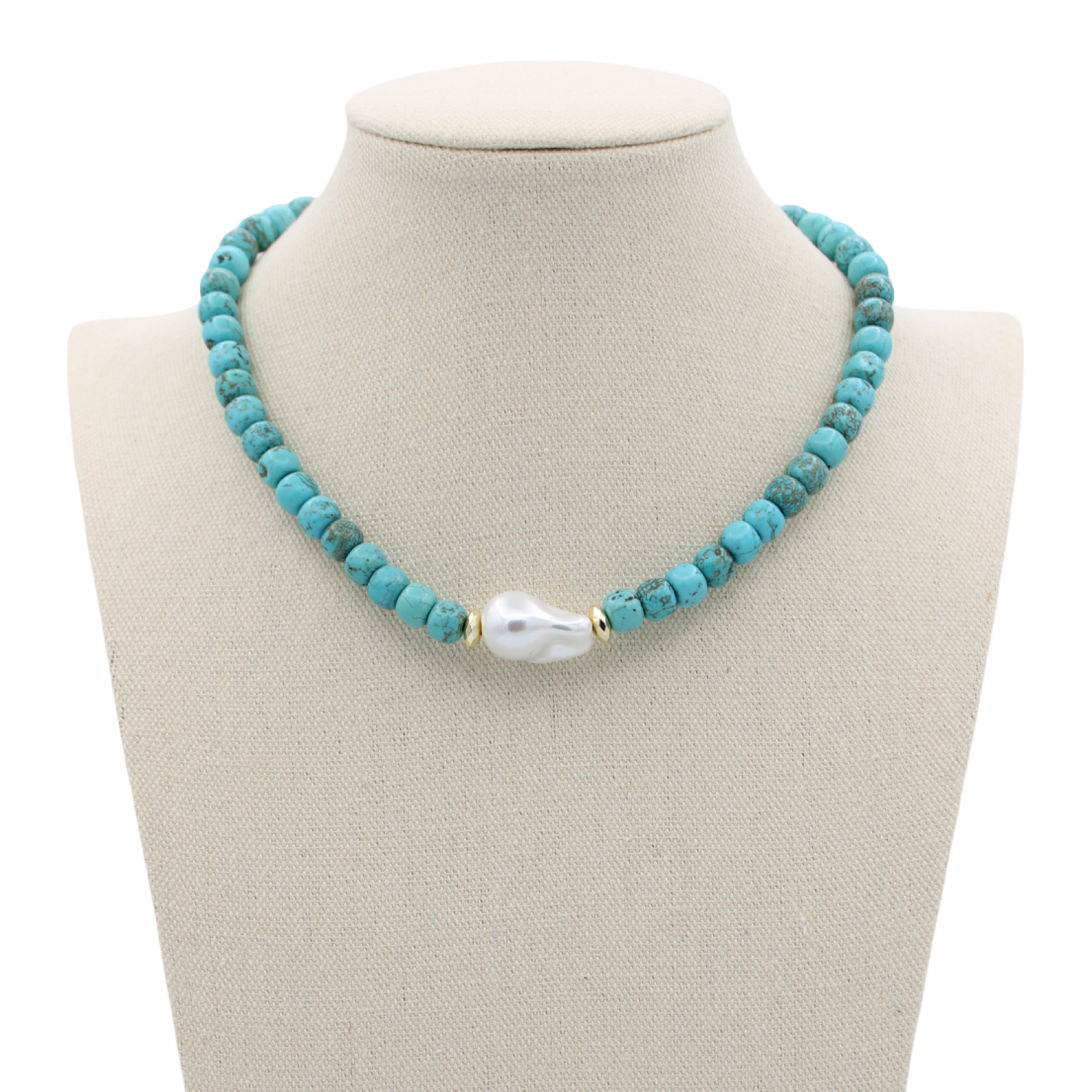 Everyone loves the color turquoise! This necklace has a beautiful unique style with a baroque pearl accent. Beads are magnesite and necklace is approximately 16" + 2" extender. Matching bracelet also available.