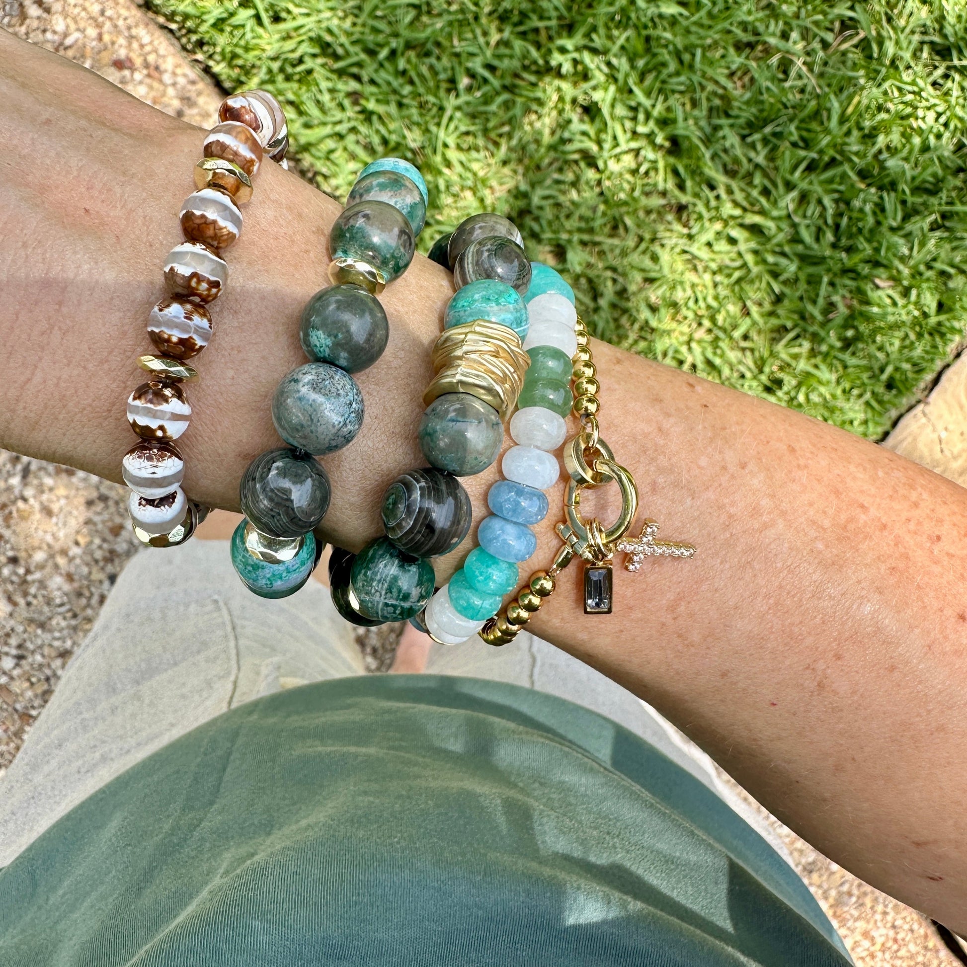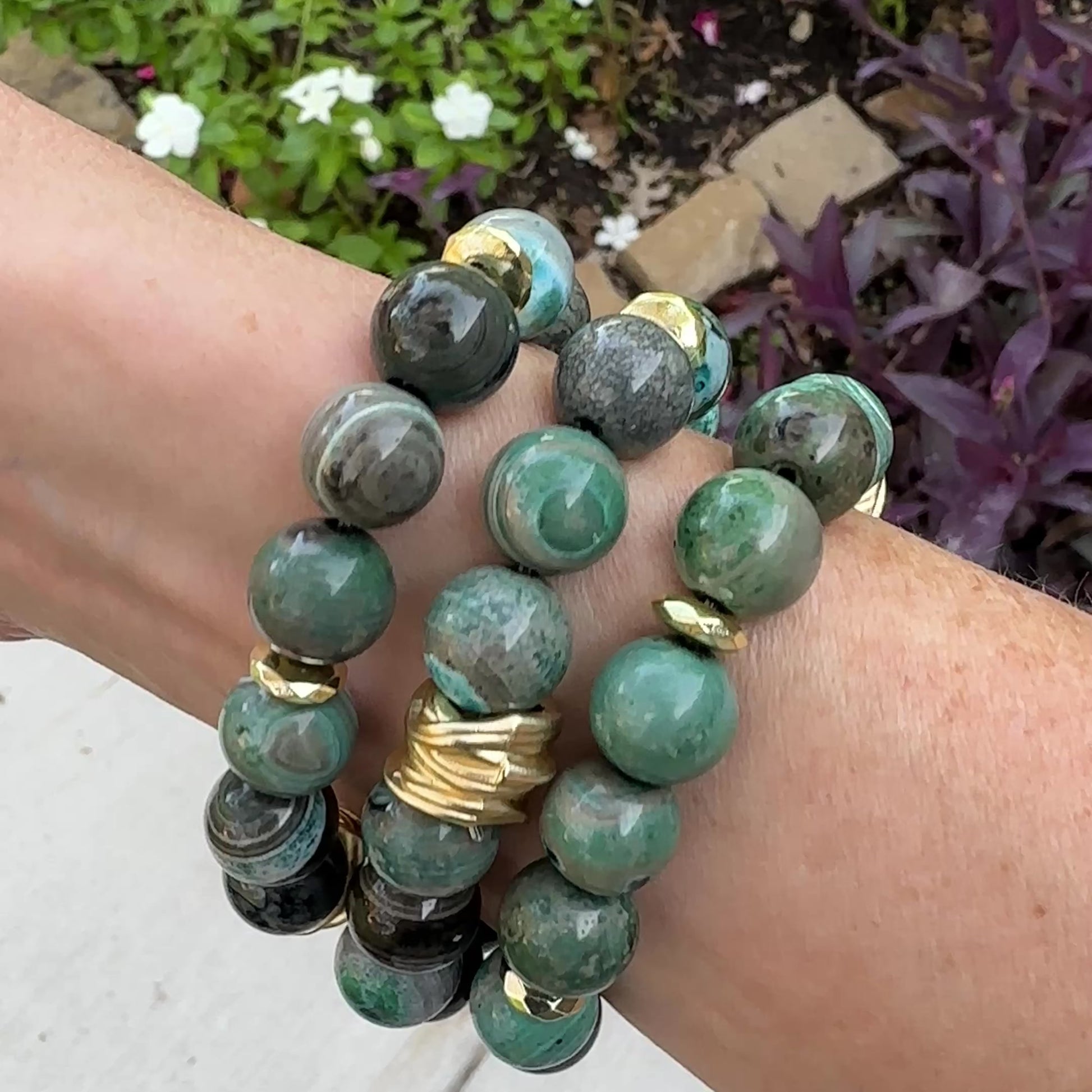 Dive into color with the Lagoon Bracelet, featuring striking 12mm fire agate beads in deep ocean blues and lush lagoon greens. Each bead has its own natural marbling. A matte gold accent adds a touch of warmth and elegance, making this bracelet a stunning statement on its own or layered with your favorites.