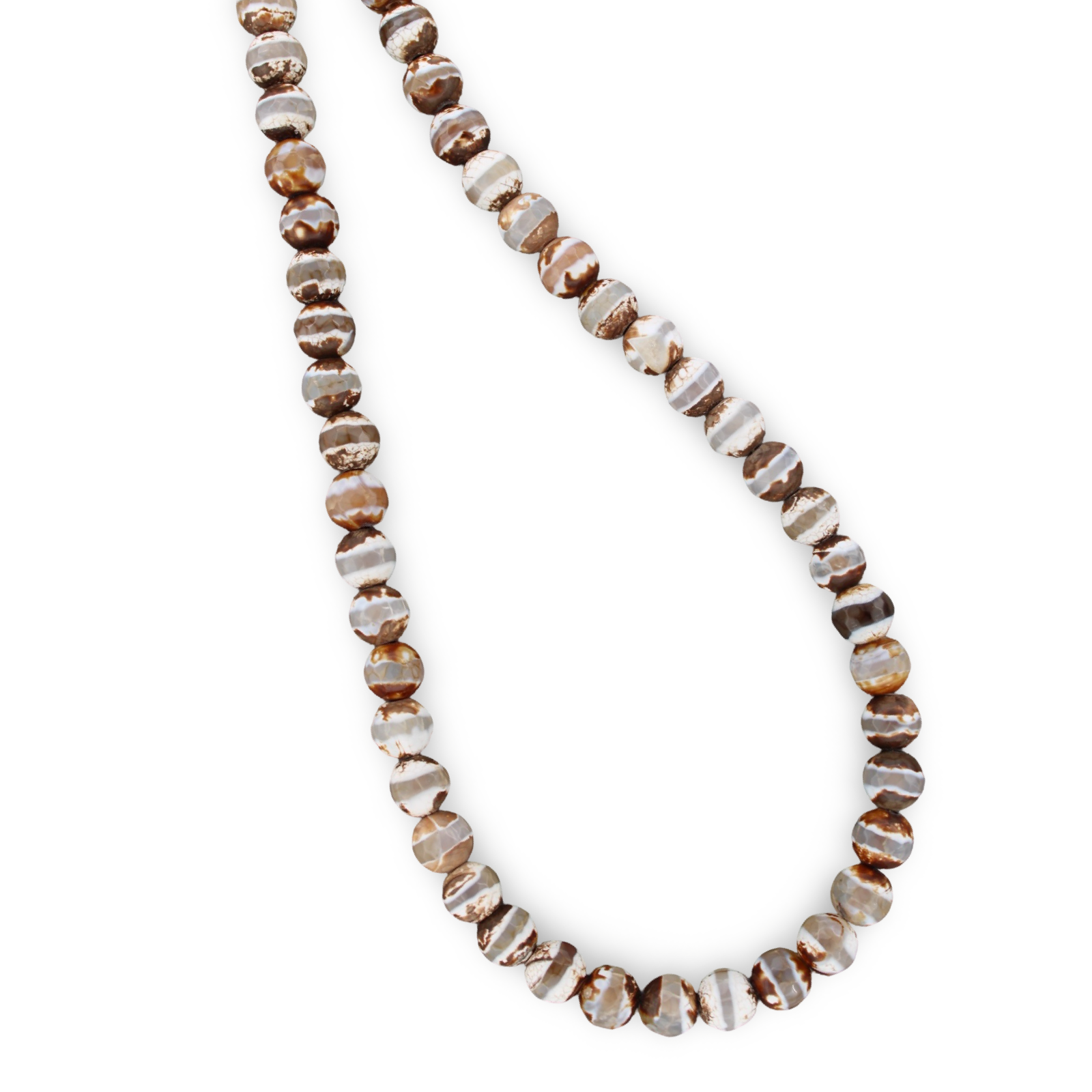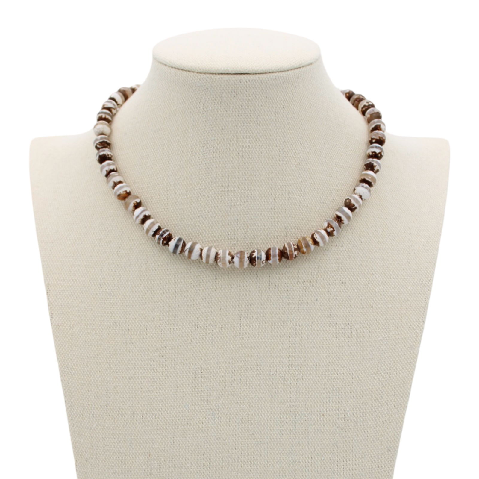 Beautiful neutrals with personality... all the shades of brown, tan, ivory and gray in 8mm Tibetan agate beads. A great look to pair with neutrals or earthy colors. Looks great layered with the Brianna necklace. Matching bracelet also available. Hand beaded to approximately 16" + 2" extender chain. Lobster clasp closure.