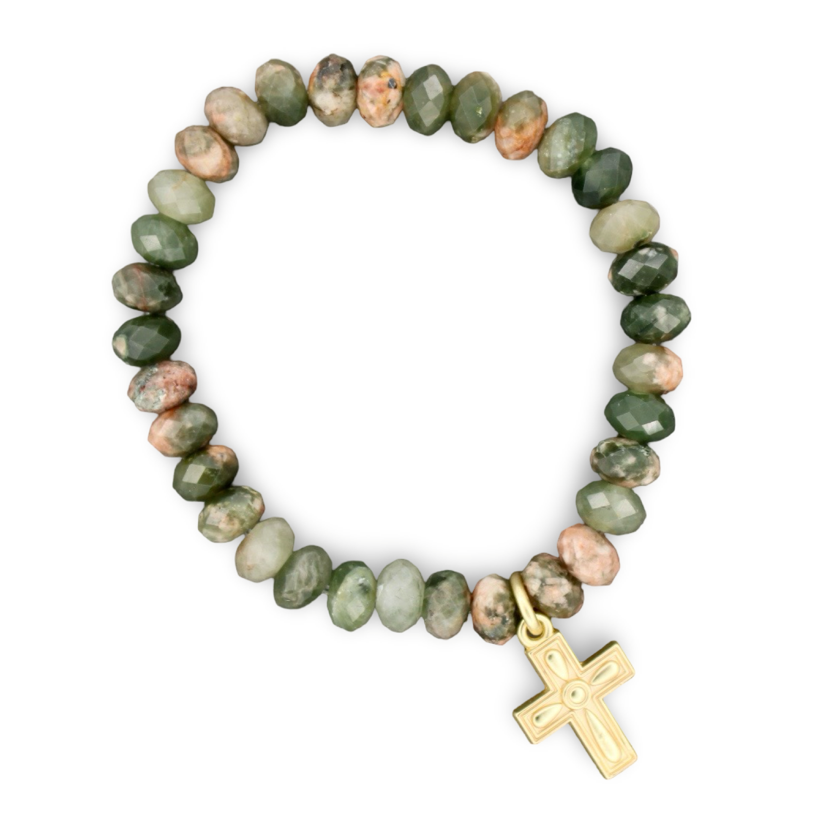 The Olivia Grace Bracelet is a meaningful blend of craftsmanship and faith. Features 8mm faceted chalcedony beads in rich, olive green tones. A matte gold cross charm adds a timeless touch, symbolizing strength, guidance, and grace. Thoughtfully designed for everyday wear, this piece carries both natural beauty and spiritual inspiration. Hand beaded to a standard length of about 7" on very strong stretch band.