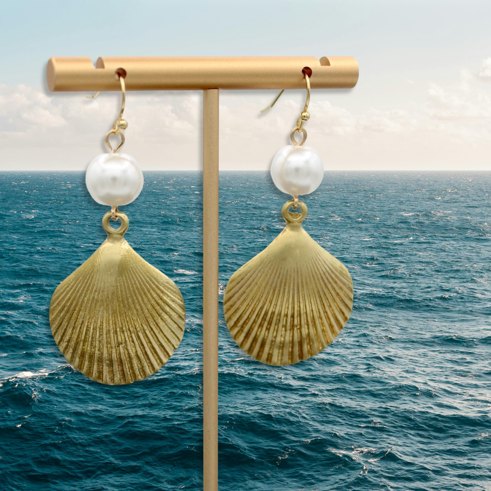 A timeless classic with a modern twist. These earrings feature a glass pearl and a beautiful brass seashell. Whether worn with a crisp white shirt or a breezy sundress, these earrings bring a touch of refined ease to your summer looks. Overall drop about 2 1/4"