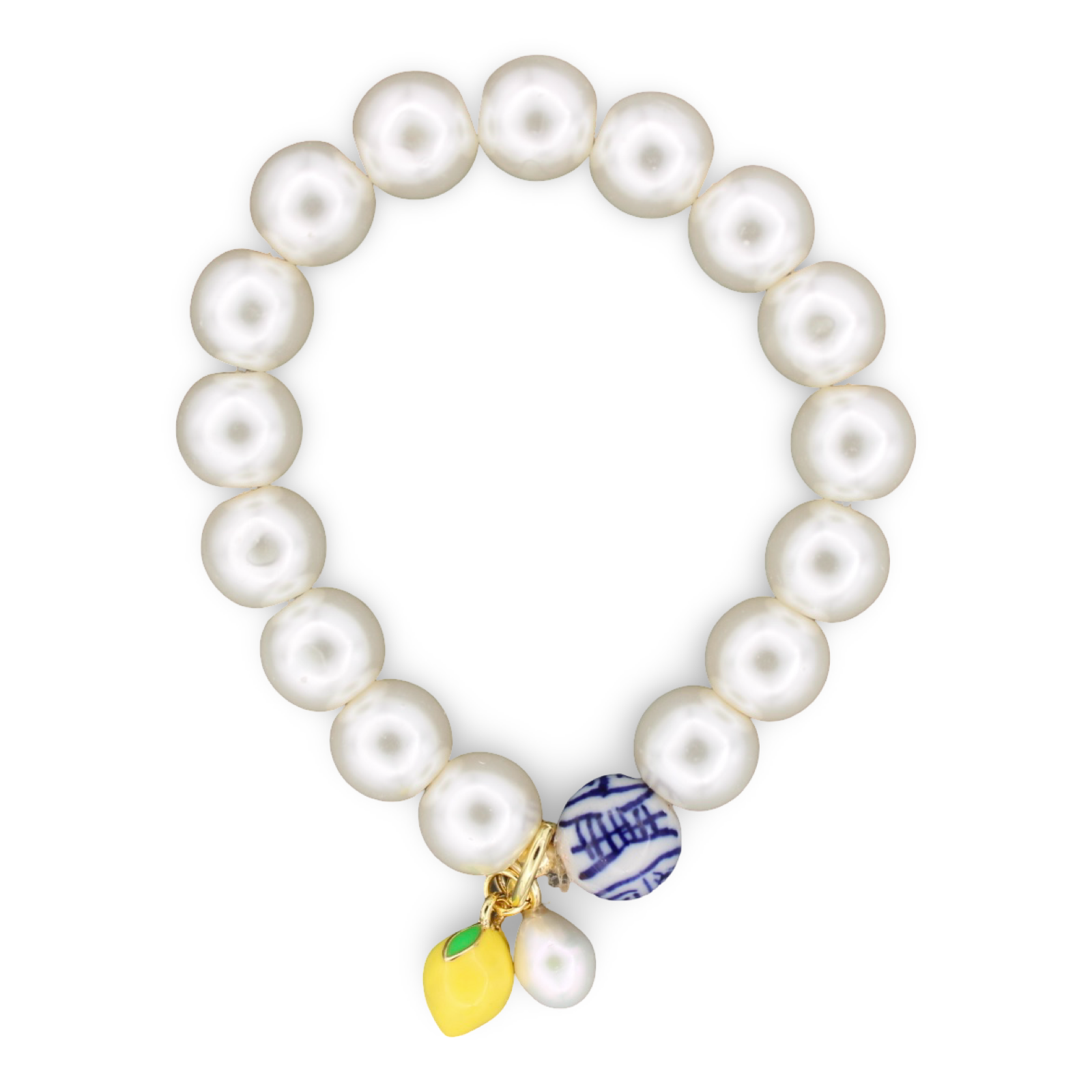 The Positano Pearl Bracelet features 12mm glass pearls, a blue and white chinoiserie bead and pearl and lemon charms, this bracelet brings an Italian Summer vibe to any look. Whether you're headed to Italy or summering around at home, the Positano Pearl bracelet is a great go-to look!