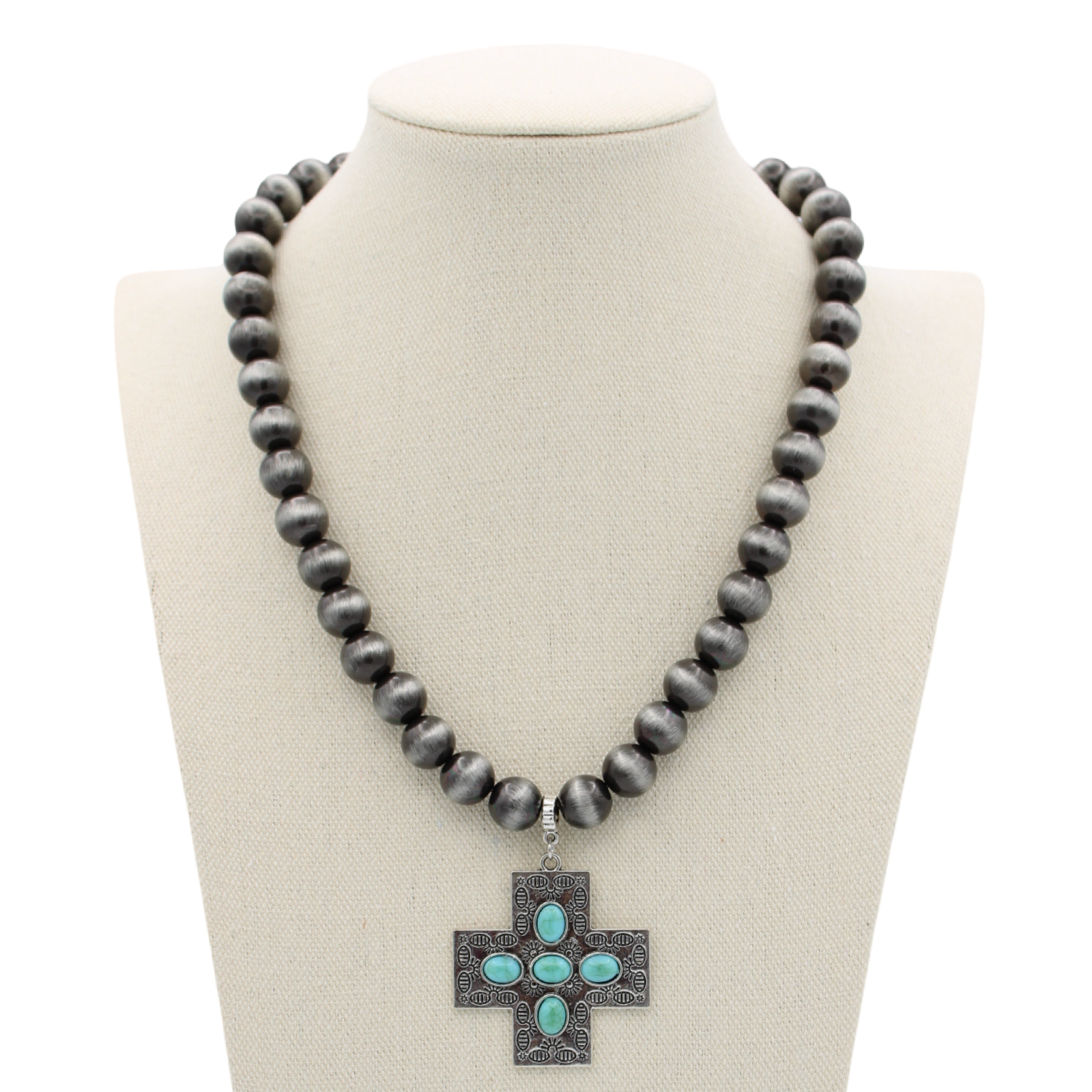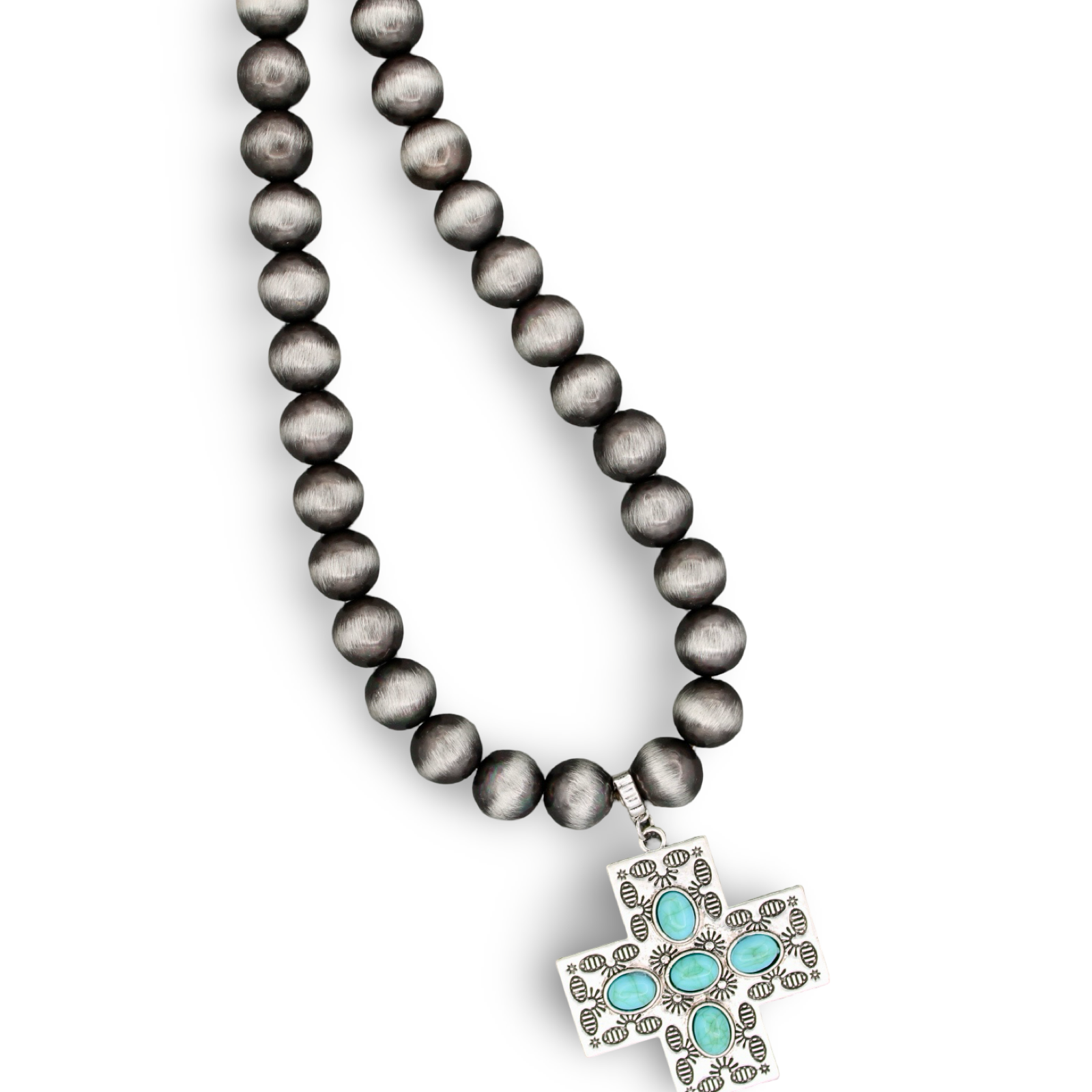 The Sophie brings a touch of East Texas glam to western styling! Make a statement with 12mm faux Navajo pearl with a stunning 2" silver tone/turquoise pendant perfect for your western chic vibe! Hand beaded to approximately 19" with a silver tone lobster clasp closure.
