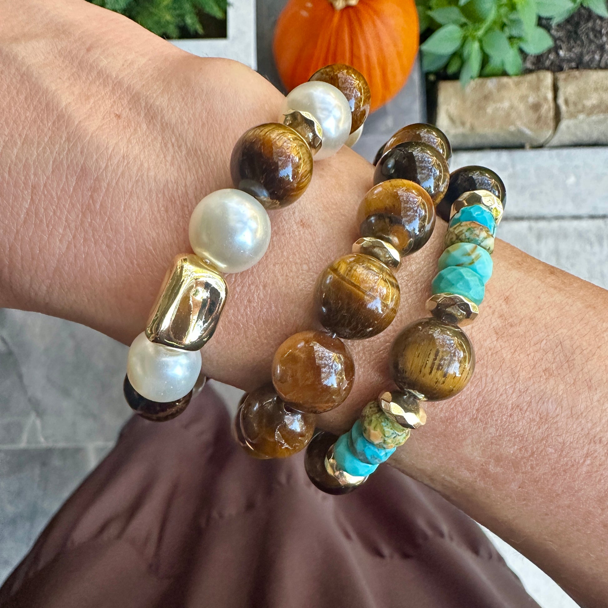 Chocolate brown is the IT color and the best way to accessorize is with rich, tigers eye! This bracelet features 12mm tigers eye beads, 12mm glass pearls and gold accents. Stretch design hand made to a standard length of about 7 1/4". Very strong construction.