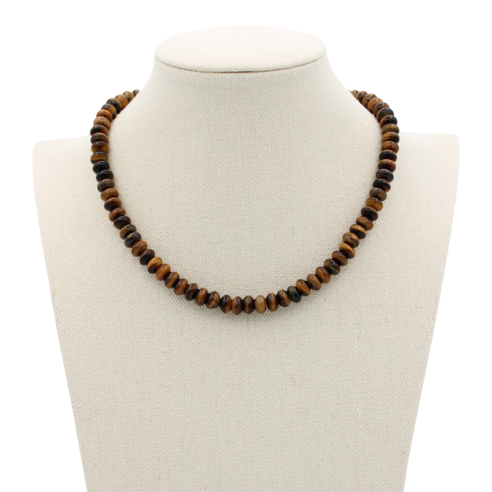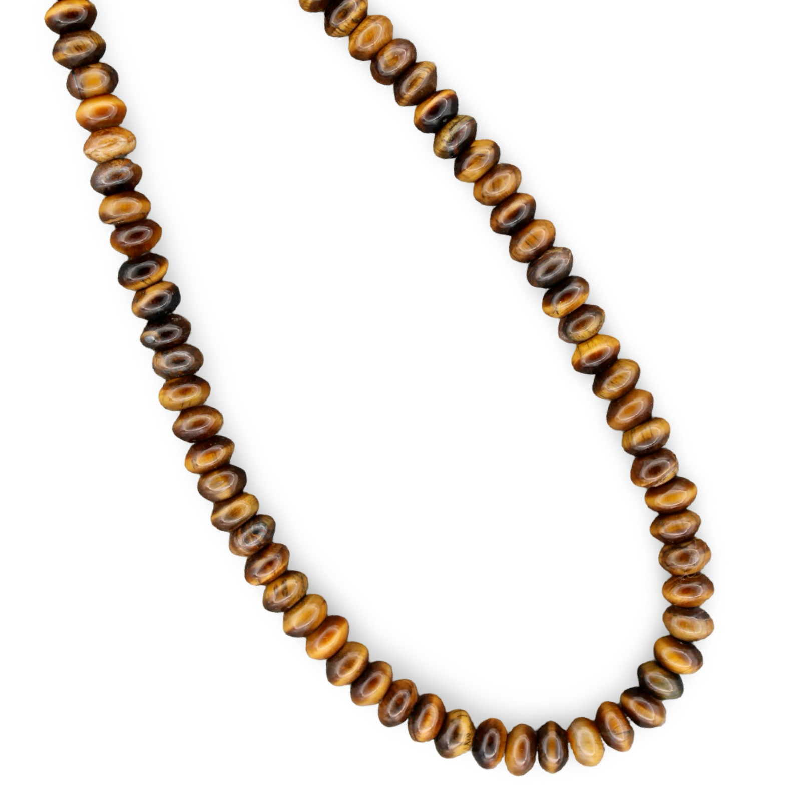 Simple and great for layering. The beauty of tigers eye in 8mm rondelle beads hand beaded to approximately 16" + 2" extender. Lobster clasp closure.