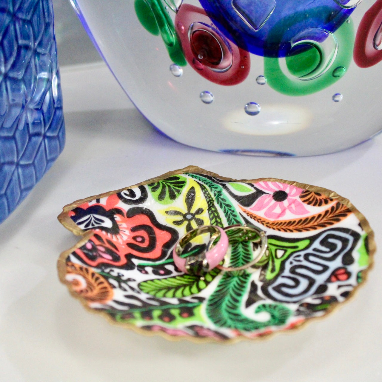 Each of these one-of-a-kind jewelry dishes begins as a natural sea shell, carefully selected for its organic shape and beauty. Measuring approximately 4–5 inches, no two are ever exactly alike. The interior is artfully decoupaged with custom designs and finished with hand-painted gold edges, adding a touch of coastal luxury. Back of shell is natural with a gold painted edge.